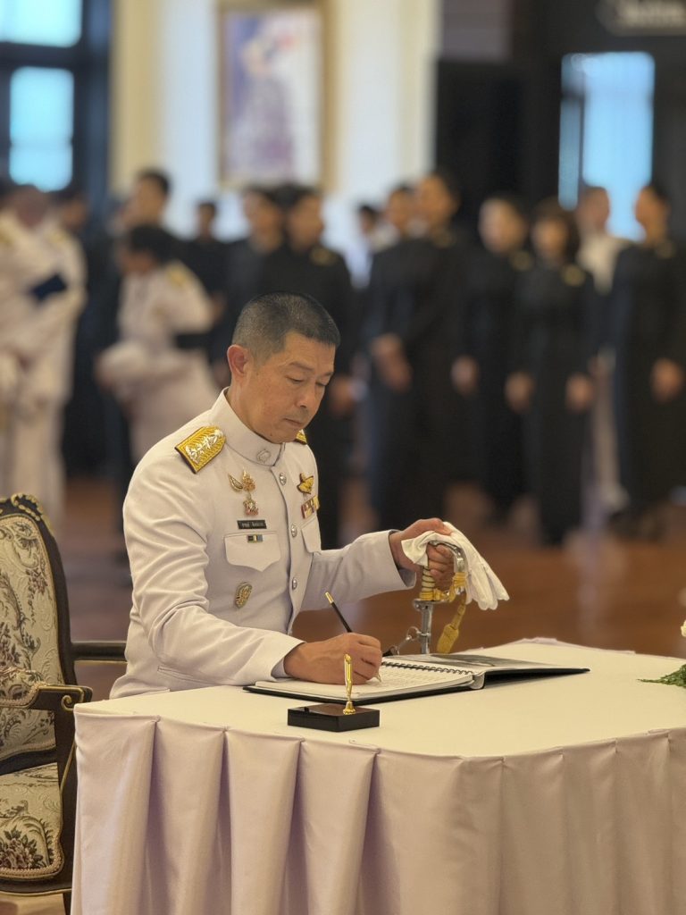 จากนั้น ผบ.ตร. พร้อมด้วยนายกสมาคมแม่บ้านตำรวจ นำข้าราชการตำรวจลงนามถวายความอาลัย สมเด็จพระนางเจ้าสิริกิติ์ พระบรมราชินีนาถ พระบรมราชชนนีพันปีหลวง ณ ห้องโถง อาคาร 1 สำนักงานตำรวจแห่งชาติ